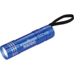 Aluminum COB flashlight with bottle opener and wrist strap is push button on/off. 80 lumen. Includes 3 AAA batteries.